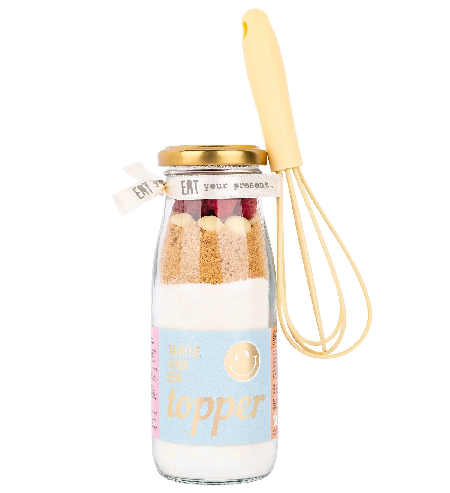 Laat iemand weten dat hij of zij een echte topper is met dit vrolijke bakflesje van 250 ml. De tekst “Taartje voor een topper!” staat prominent op de verpakking en maakt het meteen duidelijk: dit is een gebaar vol waardering. In het flesje zit een kant-en-klaar bakrecept — handig, lekker én verrassend. Daarbij komt een kleine garde die het bakplezier symboliseert. Samen vormen ze een speels én origineel geschenk — een echt uniek cadeau voor wie je wilt verrassen.