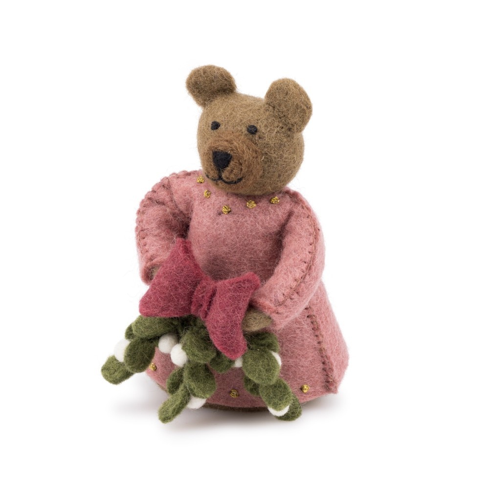 Beer in een oudroze jurk, met gouden details en een bosje maretak in haar pootjes. De grote strik maakt haar extra feestelijk. Een betoverende decoratie voor op tafel of in de vensterbank. Een uniek cadeautje, zeker met Kerst!