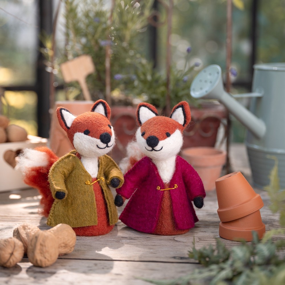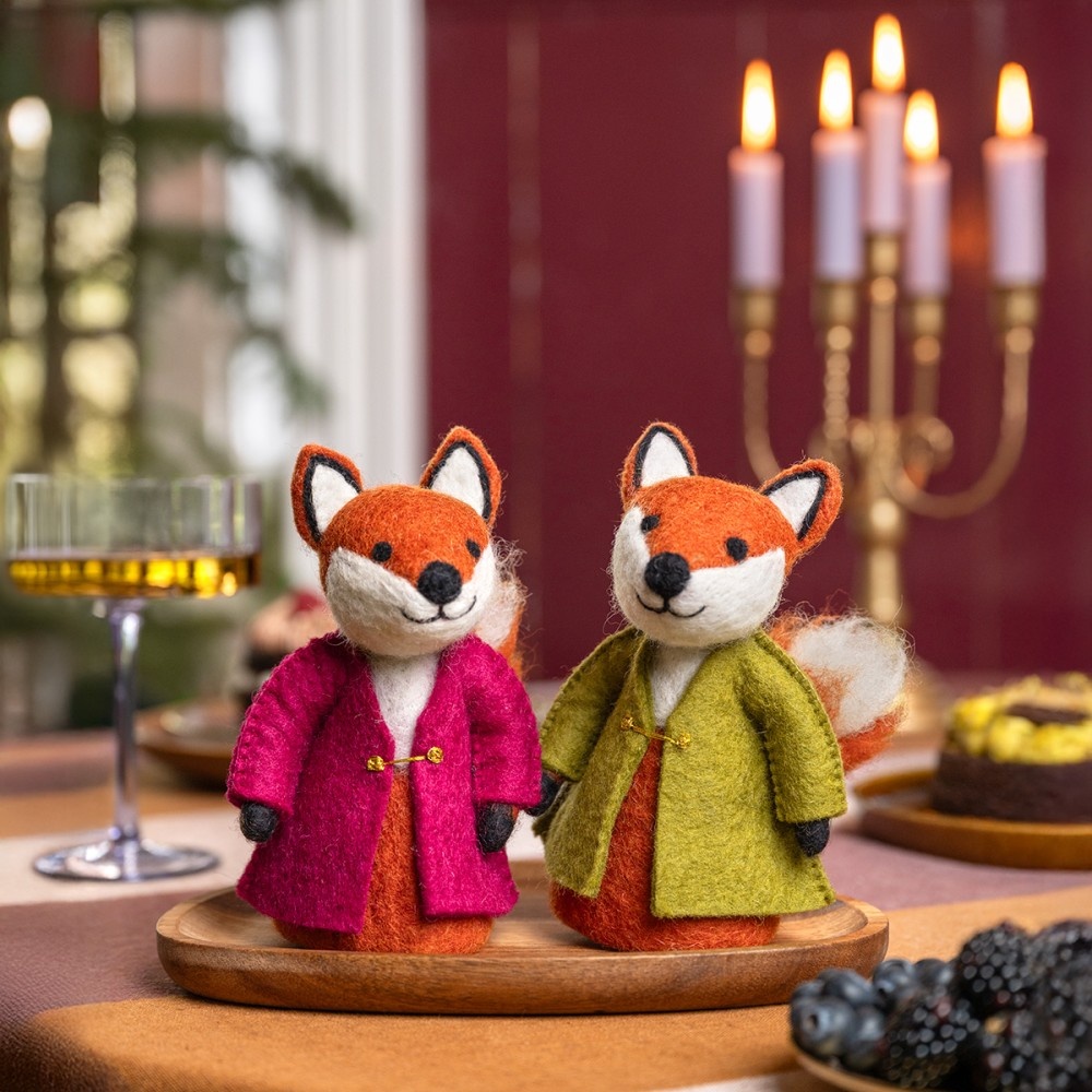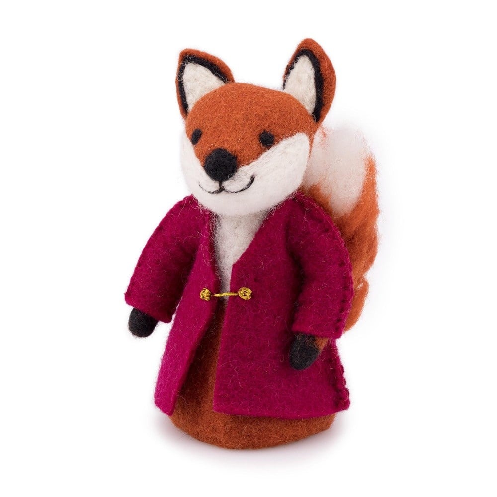 Deze handgemaakte vos in burgundy jas steelt de show met zijn vrolijke uitstraling, oranje vacht en pluizige staart. Een charmante en speelse decoratie die warmte brengt in de herfst én een sfeervolle toevoeging is voor de kinderkamer.
