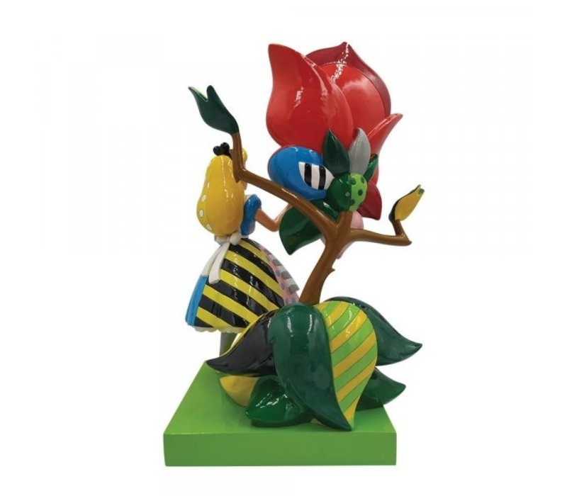 "With bold colour and compelling pattern, contemporary pop artist Romero Britto captures the fun and whimsy of Disney. Redesigning a scene from Alice and Wonderland, Alice greets a talking rose with glittering grace. Designed in the US by Miami based Pop Artist Romero Britto in celebration of the 70th Anniversary of Disney's classic Alice in Wonderland. Figurine is made from cast stone. Product is supplied in branded gift box. Unique variations should be expected as product is hand painted. Not a toy or children's product. Intended for adults only."