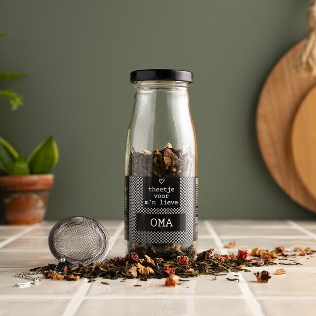 Verras je oma met dit lieve theeflesje van Geven is Leuker, inclusief thee-ei en kaartje. Een warm momentje voor haarzelf, vol smaak en aandacht. Een persoonlijk en hartverwarmend uniek cadeau om te geven aan jouw lieve oma.