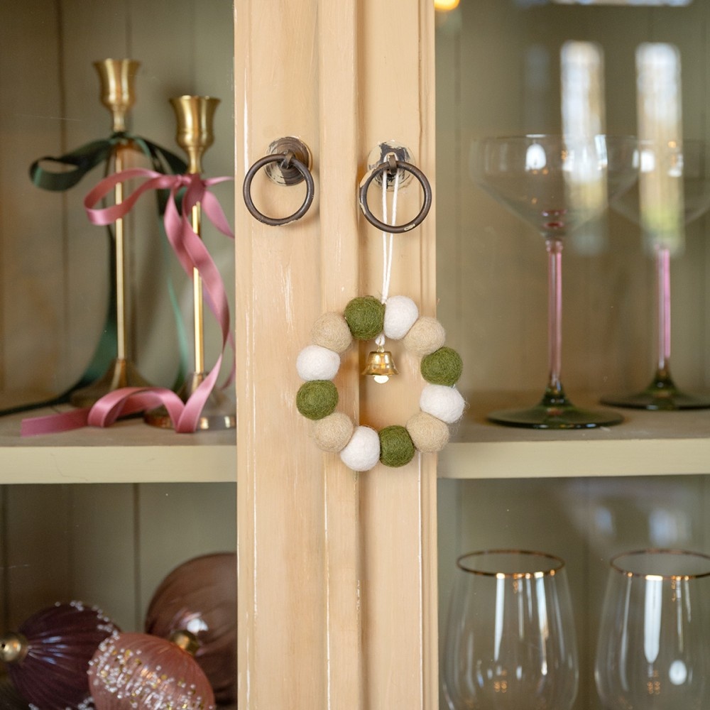 Vilten hanger in de vorm van een krans, gemaakt van viltballetjes in warme kersttinten en afgewerkt met een goudkleurig belletje. Voorzien van ophangtouwtje. Fairtrade, sfeervol handwerk en een uniek cadeau van Sjaal met Verhaal.
