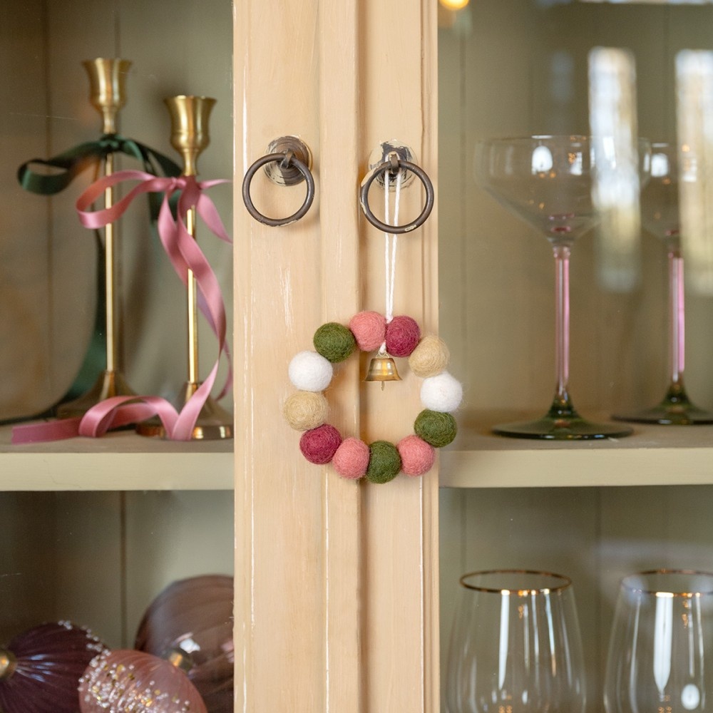 Vilten hanger in de vorm van een krans, gemaakt van viltballetjes in warme kersttinten en afgewerkt met een goudkleurig belletje. Voorzien van ophangtouwtje. Fairtrade, sfeervol handwerk en een uniek cadeau van Sjaal met Verhaal.