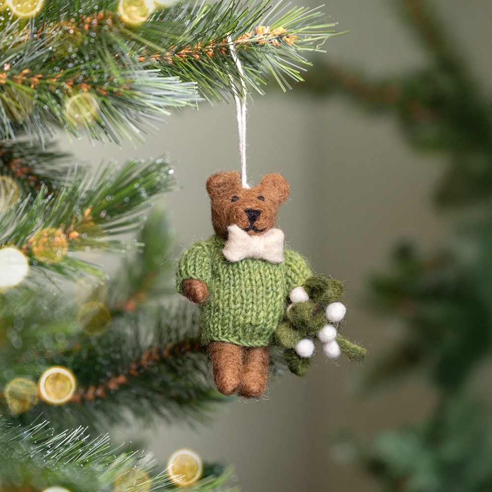 Meneer Beer met maretak in een frisse groene trui en een witte strik. Een gezellige hanger die symbool staat voor liefde en samenzijn. Perfect voor in de kerstboom of aan een feestelijk lint. Een uniek cadeau van Sjaal met Verhaal!