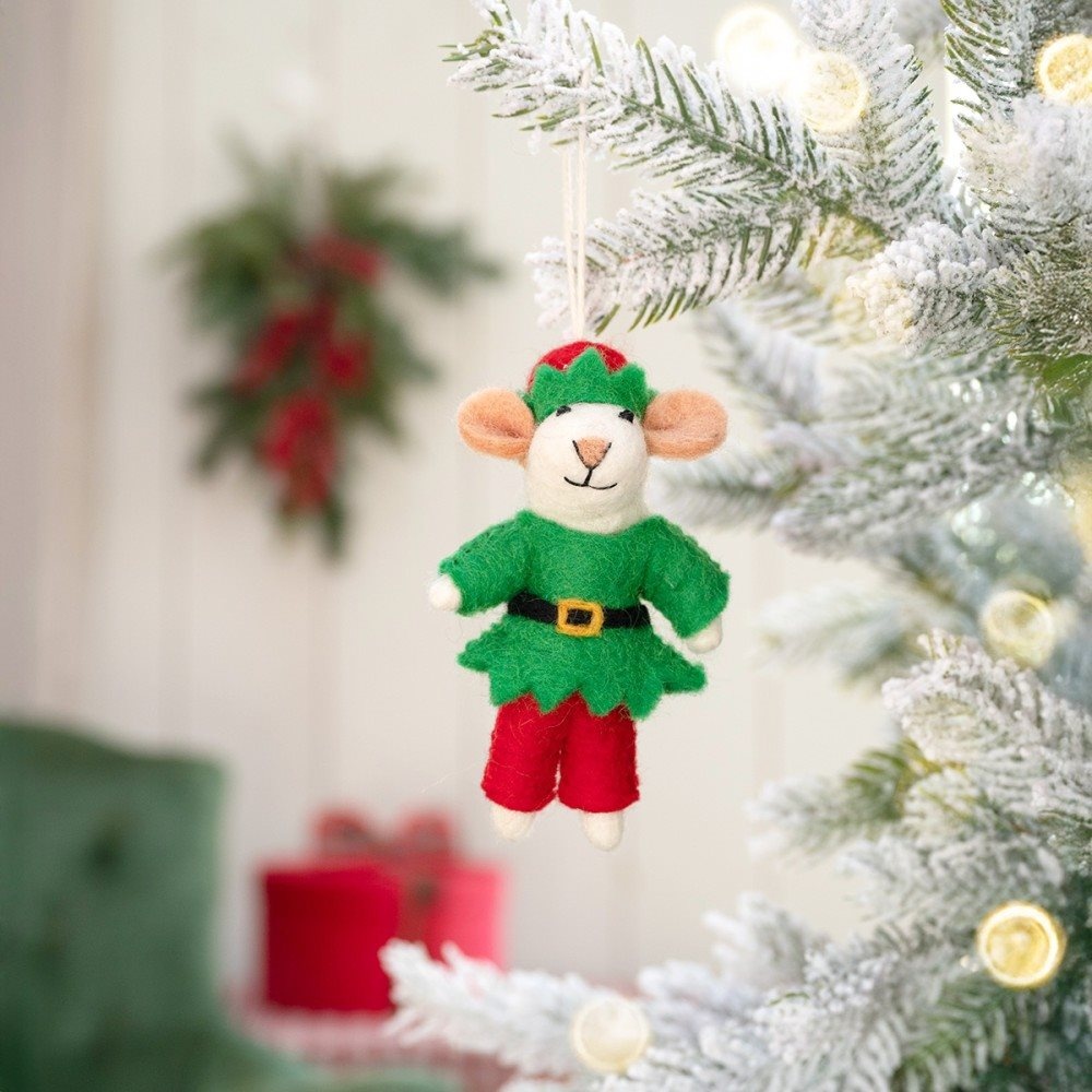 Deze hanger van een muis als kerstelf, met groene tuniek en puntmuts, brengt direct feestelijke warmte. Dankzij het touwtje hang je hem zo in de boom. Fairtrade gemaakt door Sjaal met Verhaal: een uniek cadeau vol charme en een blijvende herinnering.