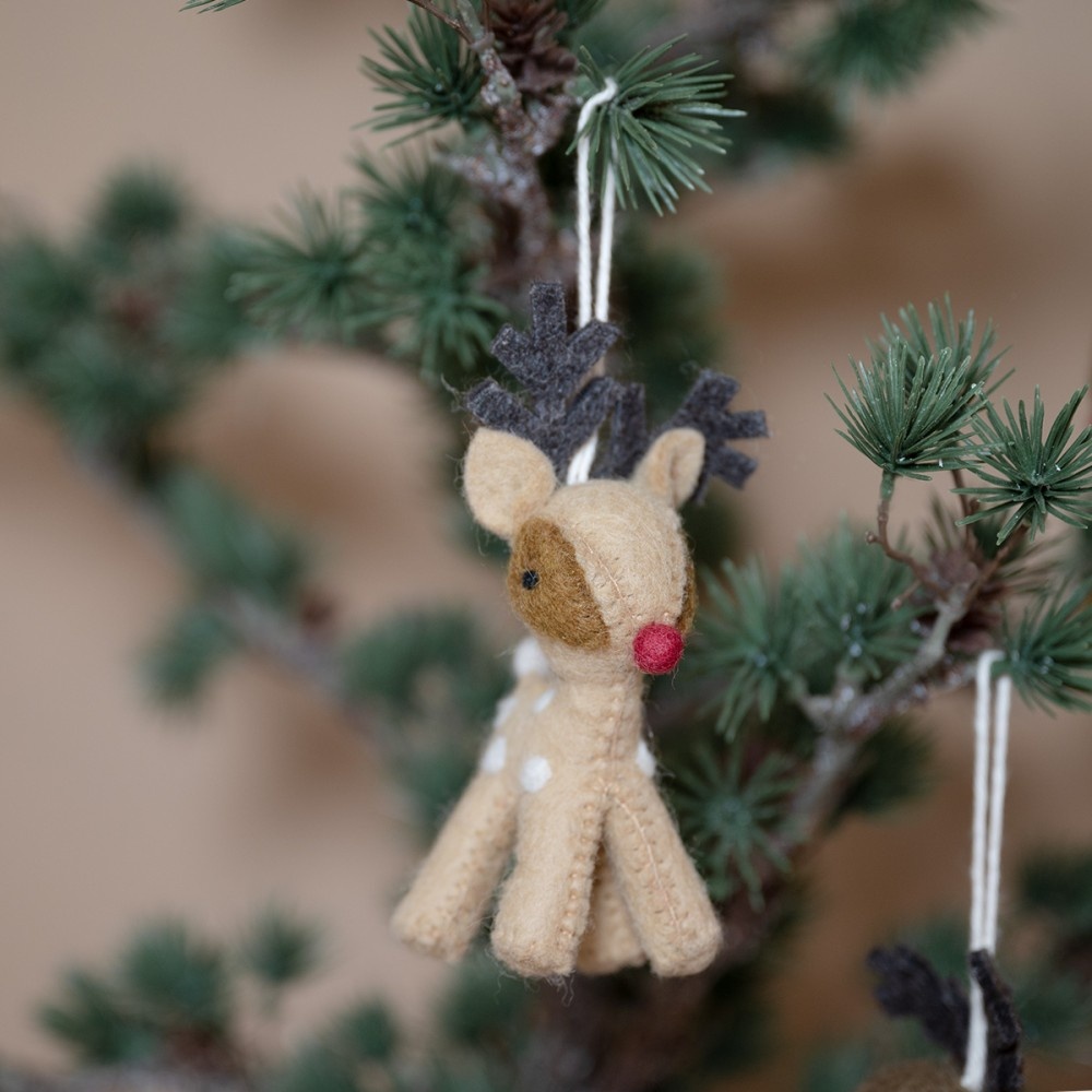 Hanger rendier in fudgekleurig vilt, ook verkrijgbaar in drie kleuren. Een speelse en feestelijke toevoeging aan je kerstboom of winterdecor. Fairtrade handgemaakt, duurzaam en een uniek cadeau van Sjaal met Verhaal.