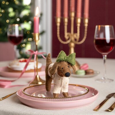 Een prachtige XL teckel van Sjaal met Verhaal in crèmekleurig kerstpakje met maretakdecoratie en groene strik op het oor. Een eigenwijze en feestelijke hanger vol persoonlijkheid. Laat hem vrolijk bungelen in je kerstboom of aan een kastdeur.