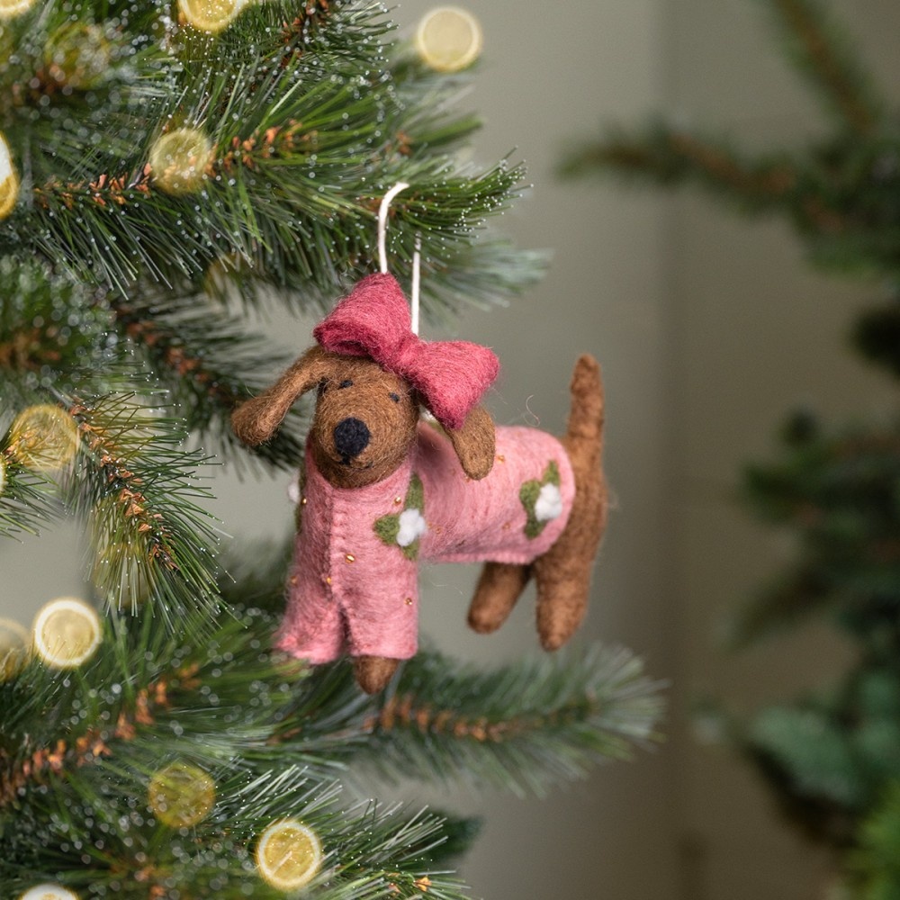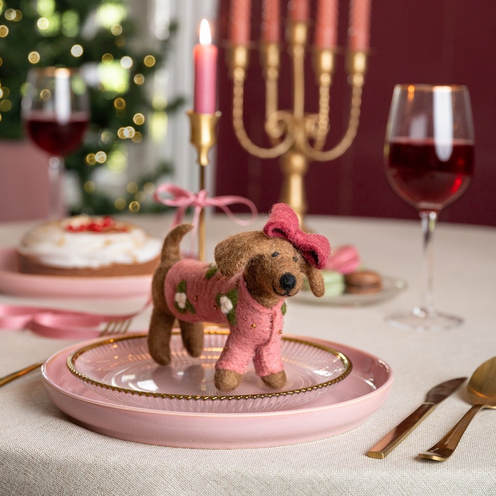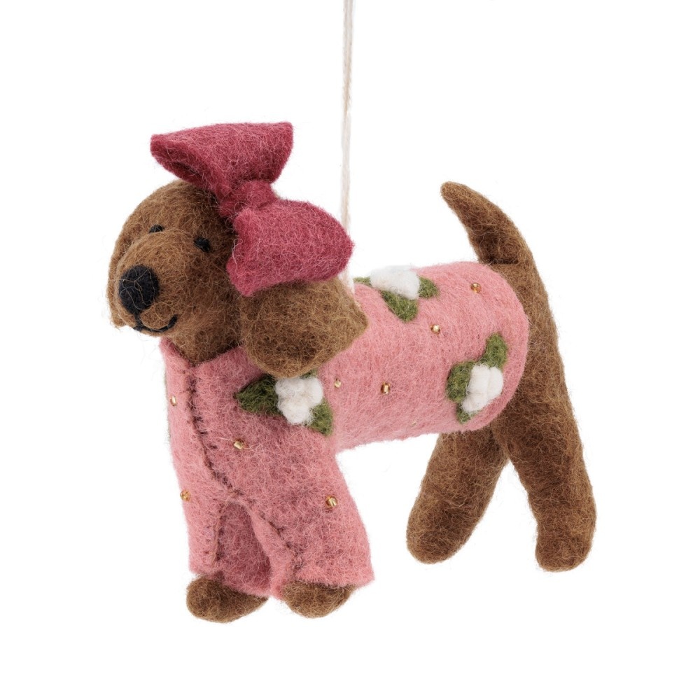 XL teckel in een oudroze kerstjasje met maretakmotief en grote strik op het oor. Een vrolijke hanger met een feestelijke uitstraling. Perfect om je boom of muur een eigenzinnige touch te geven. Een uniek cadeau van Sjaal met Verhaal!
