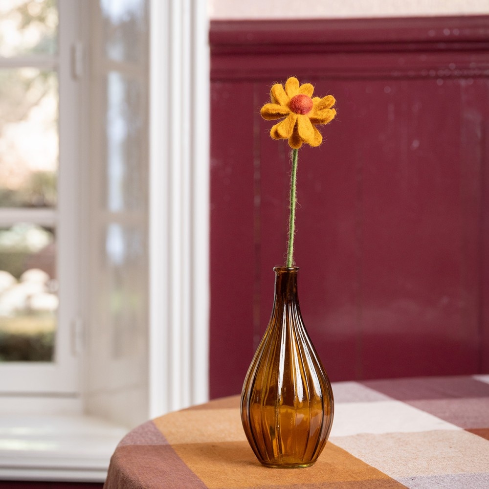 Vilten margrietje van Sjaal met Verhaal in okergeel met een warmrood hart en een lange groene steel. Perfect in een vaasje of herfstboeket en mooi te combineren met andere vilten bloemen voor een sfeervolle decoratie. Een uniek cadeau!