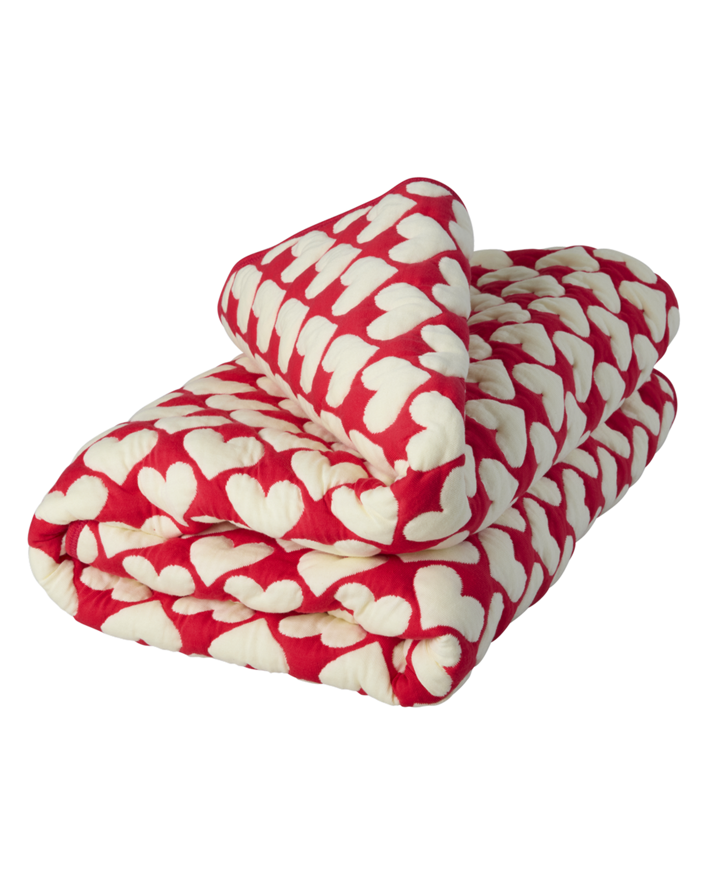 Zachte katoenen quilt van RICE in warm rood, versierd met lieve rode hartjes. Formaat 130x180 cm, perfect voor bed of bank en heerlijk om onder weg te kruipen. Geeft direct sfeer, kleur en geborgenheid aan je interieur. Een uniek item vol warmte en liefde