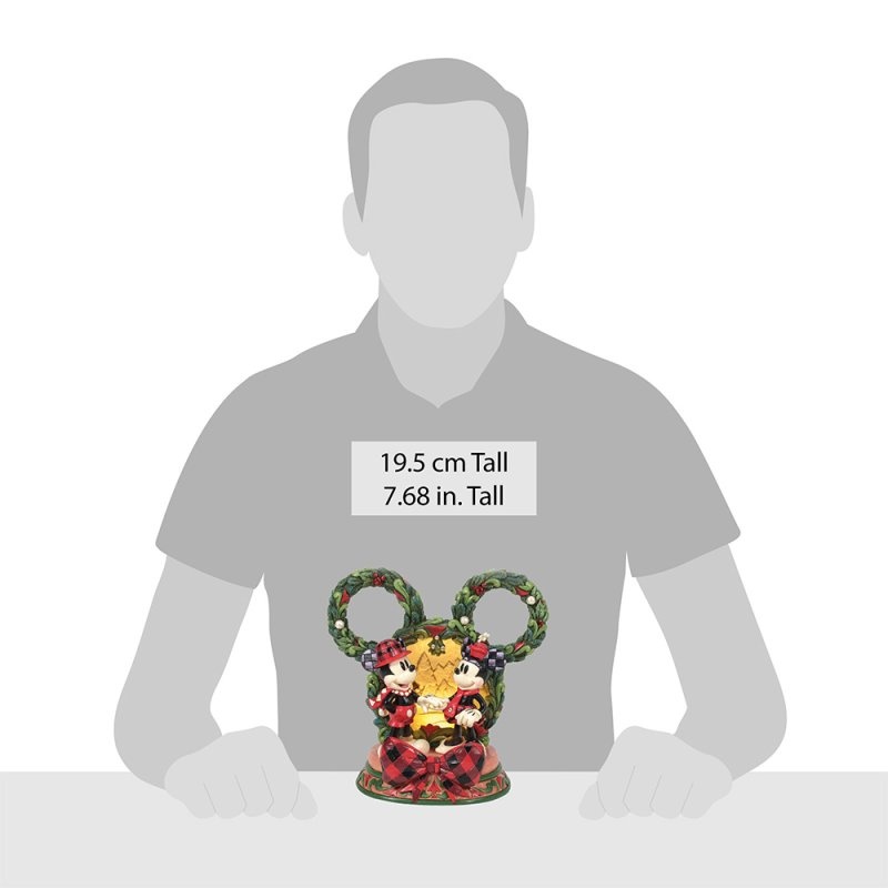 "This delightful Jim Shore Christmas scene captures Mickey and Minnie holding hands beneath a glowing LED diorama, framed by a festive Mickey-shaped garland adorned with berries and pearl accents. It radiates seasonal magic with holiday charm. This First Edition piece is numbered 1-1000 worldwide and signed by Jim Shore on a special understamp."