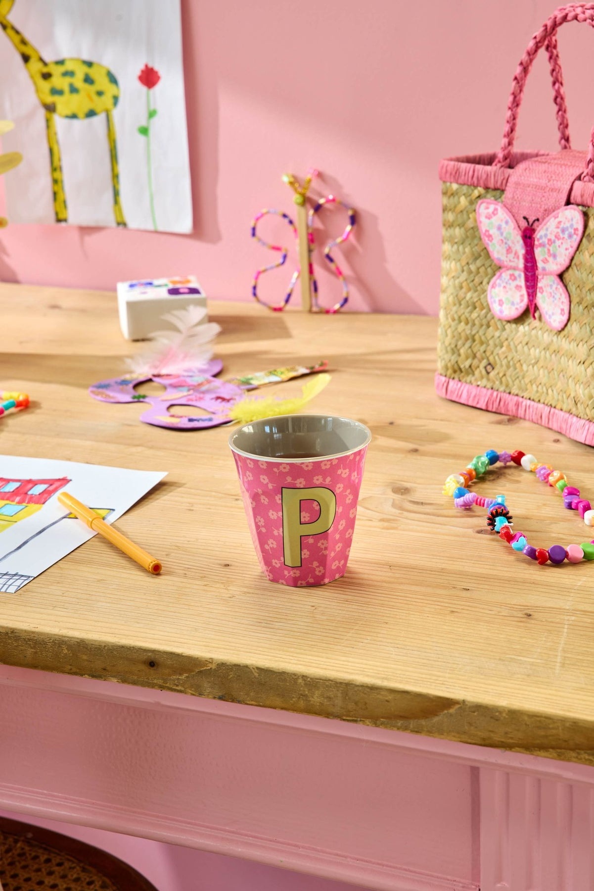 Melamine mok van RICE met de letter P in vrolijke kleuren en bloemenprint. Perfect voor drinken, pennen of picknicks. Mix en match om berichten te maken of te personaliseren voor het gezin. Een praktische favoriet en een uniek cadeau!
