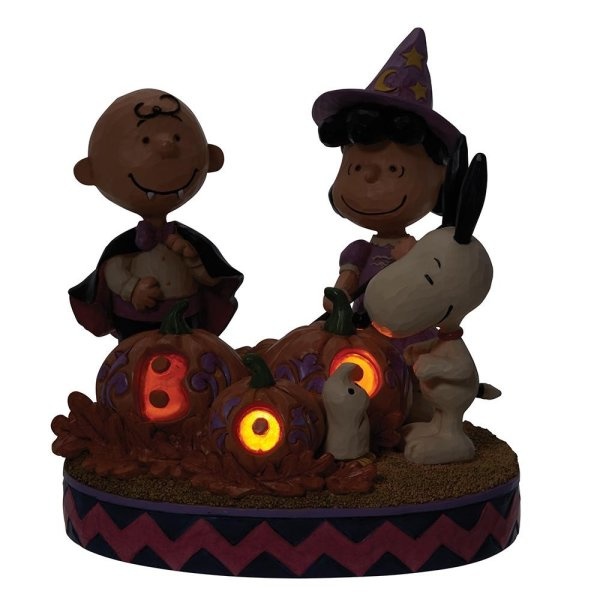 "Charlie Brown, Lucy, and Snoopy gather around their light up pumpkins to celebrate Halloween together. This figurine is made from cast stone and packed in a branded gift box so a perfect gift for your friends or to add to your own collection. Unique variations should be expected as this product is hand painted. Not a toy or children's product. Intended for adults only. Height: 13.0cm Requires 3 AAA Batteries (Not included)."