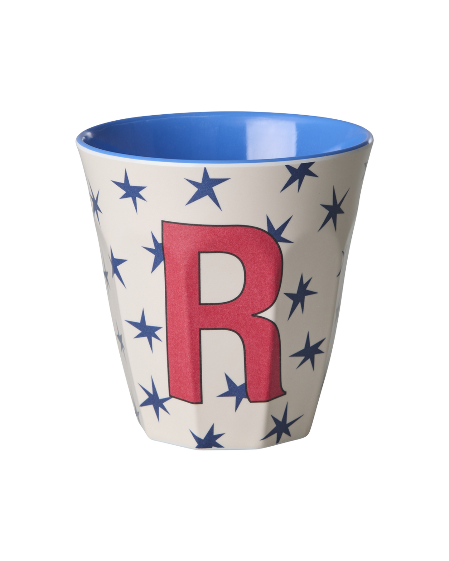 Melamine mok van RICE met de letter R in vrolijke kleuren en sterrenprint. Perfect voor drinken, pennen of picknicks. Mix en match om berichten te maken of te personaliseren voor het gezin. Een praktische favoriet en een uniek cadeau!