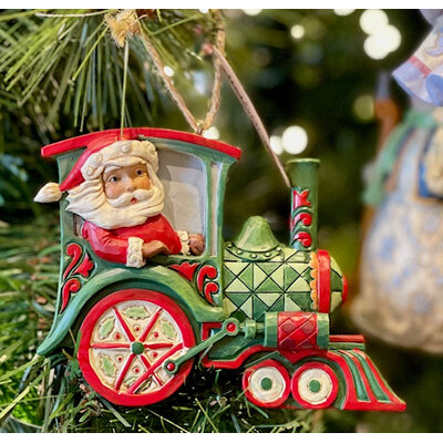 "All aboard the Christmas train, next stop, holiday memories! Santa steers this fantastic red and green rosemaling locomotive with mistletoe powered wheels. Hang this stylish train in your tree and admire the creative craftsmanship of Jim Shore."