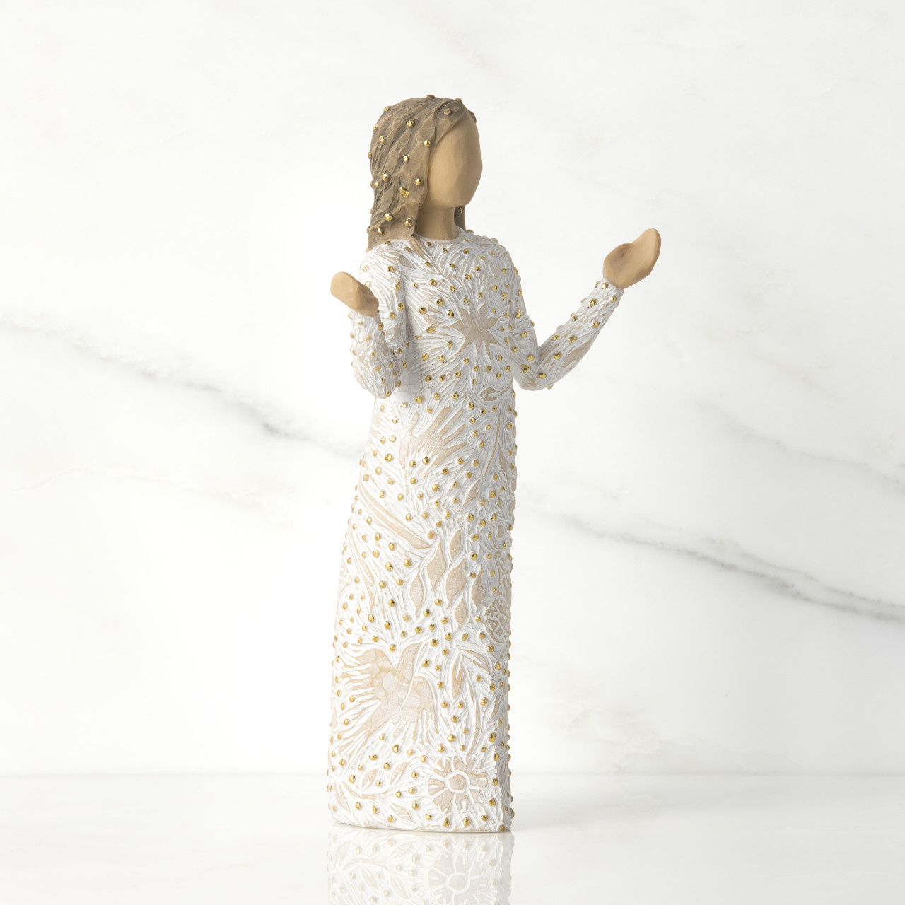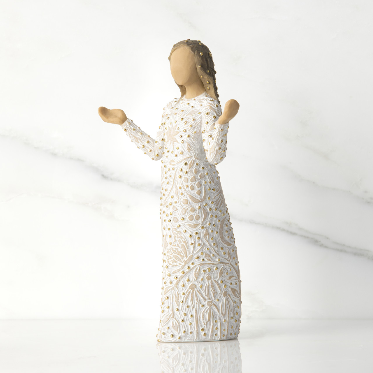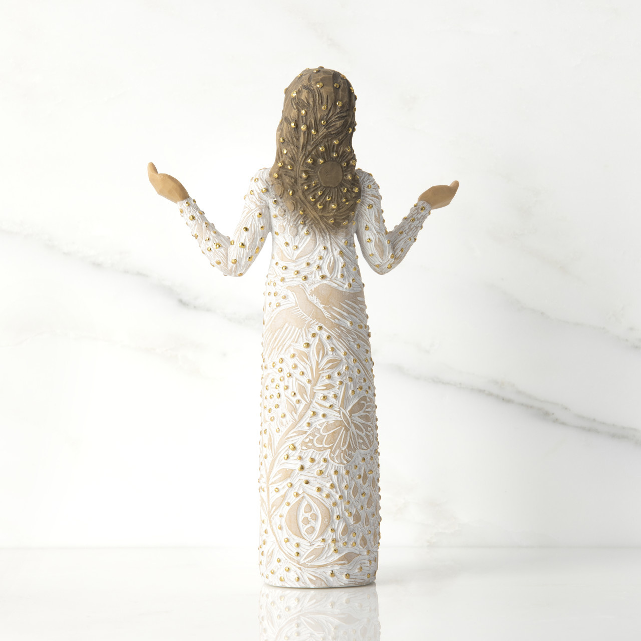 “I was thinking about making art that reflects the natural beauty all around us—that causes us to change our mood or lift our spirits… For me, beauty found in nature has this transformative power. This figure presents the many small miracles happening all around us. Her open arms are a historical and universal gesture of blessing, both welcoming and inclusive. Her carvings, dotted with gold, of plants, flowers, birds, butterflies, the cycle of seasons, are the everyday earthly blessings that enrich our lives immeasurably. Everyday Blessings could be a gift to celebrate friendship, a love of nature, or be a welcoming presence in the home. She could be placed in the Nativity as an angel, offering her precious gifts, or stand alone as a unique holiday piece.”