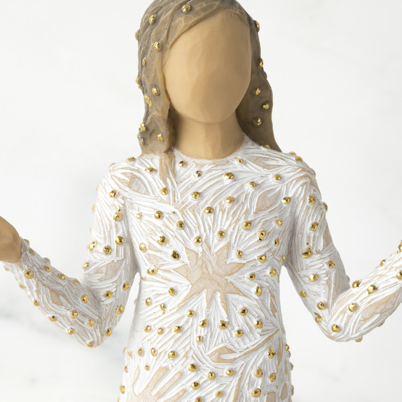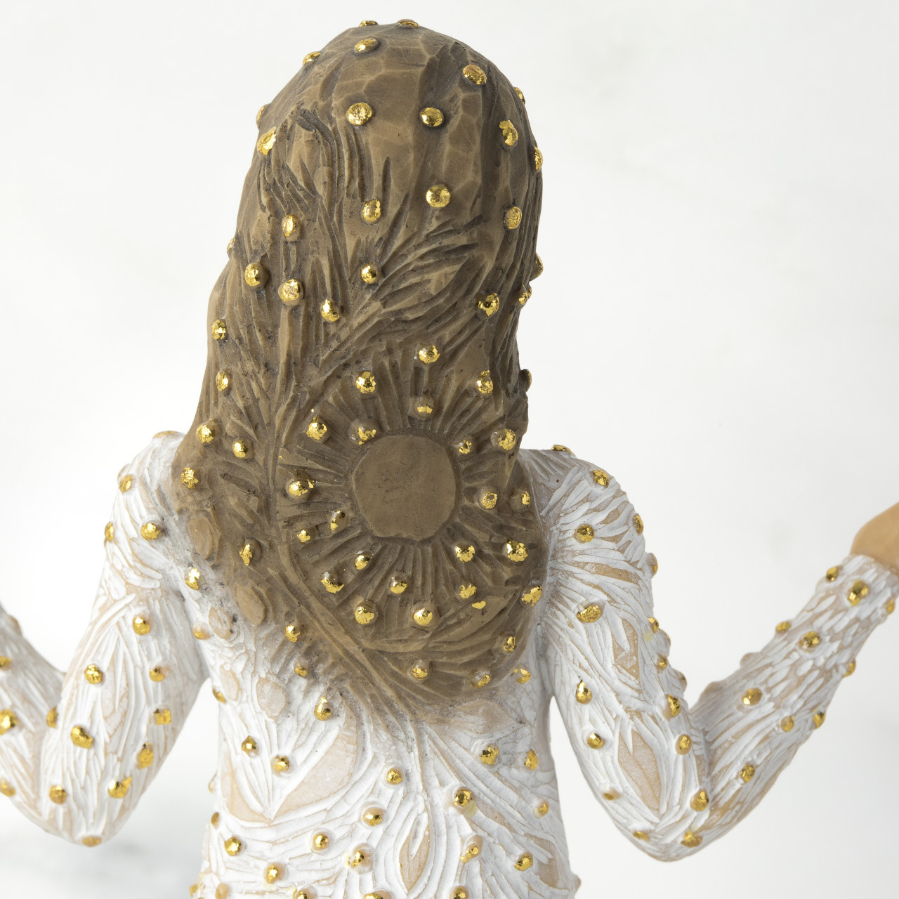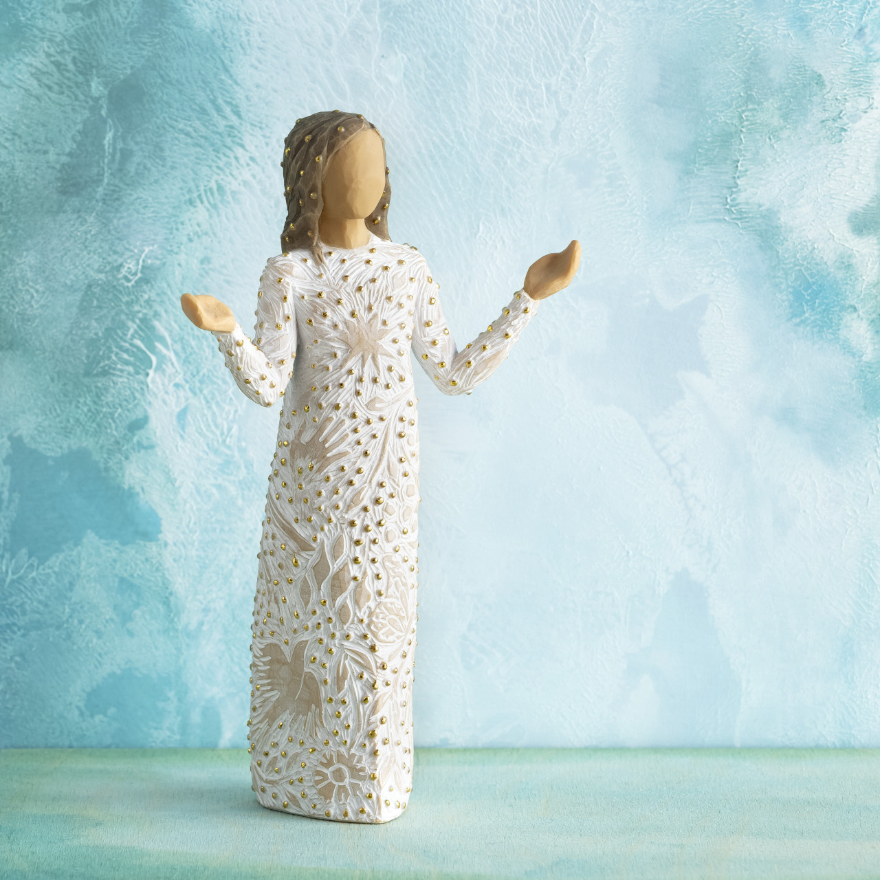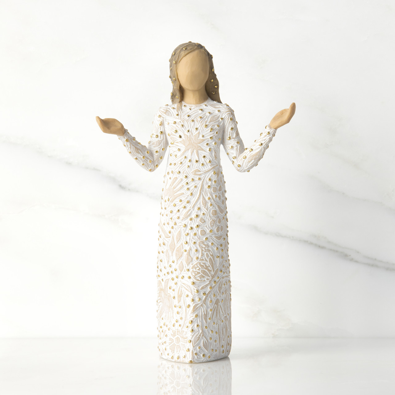 “I was thinking about making art that reflects the natural beauty all around us—that causes us to change our mood or lift our spirits… For me, beauty found in nature has this transformative power. This figure presents the many small miracles happening all around us. Her open arms are a historical and universal gesture of blessing, both welcoming and inclusive. Her carvings, dotted with gold, of plants, flowers, birds, butterflies, the cycle of seasons, are the everyday earthly blessings that enrich our lives immeasurably. Everyday Blessings could be a gift to celebrate friendship, a love of nature, or be a welcoming presence in the home. She could be placed in the Nativity as an angel, offering her precious gifts, or stand alone as a unique holiday piece.”